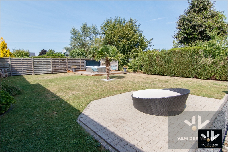 Buiten geniet je van een onderhoudsvriendelijke tuin: een mooi gazon achteraan, siergrassen vooraan en meerdere terrassen waar je op elk moment van de dag kan genieten. Achteraan op het perceel vind je bovendien een grote carport voor twee wagens, een tuinhuis en een overdekte stalling. Een extra troef is de jacuzzi, waar het héérlijk vertoeven is. In onderling overleg is het eventueel mogelijk om deze van de verkopers over te nemen.