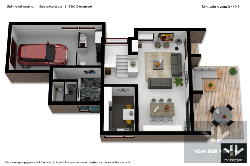 Een half niveau hoger is er de inkomhal met vestiaire, een toilet, de keuken en aansluitend de ruime woonkamer met zicht op de mooi aangelegde tuin en het deels overdekt en zonnig terras.